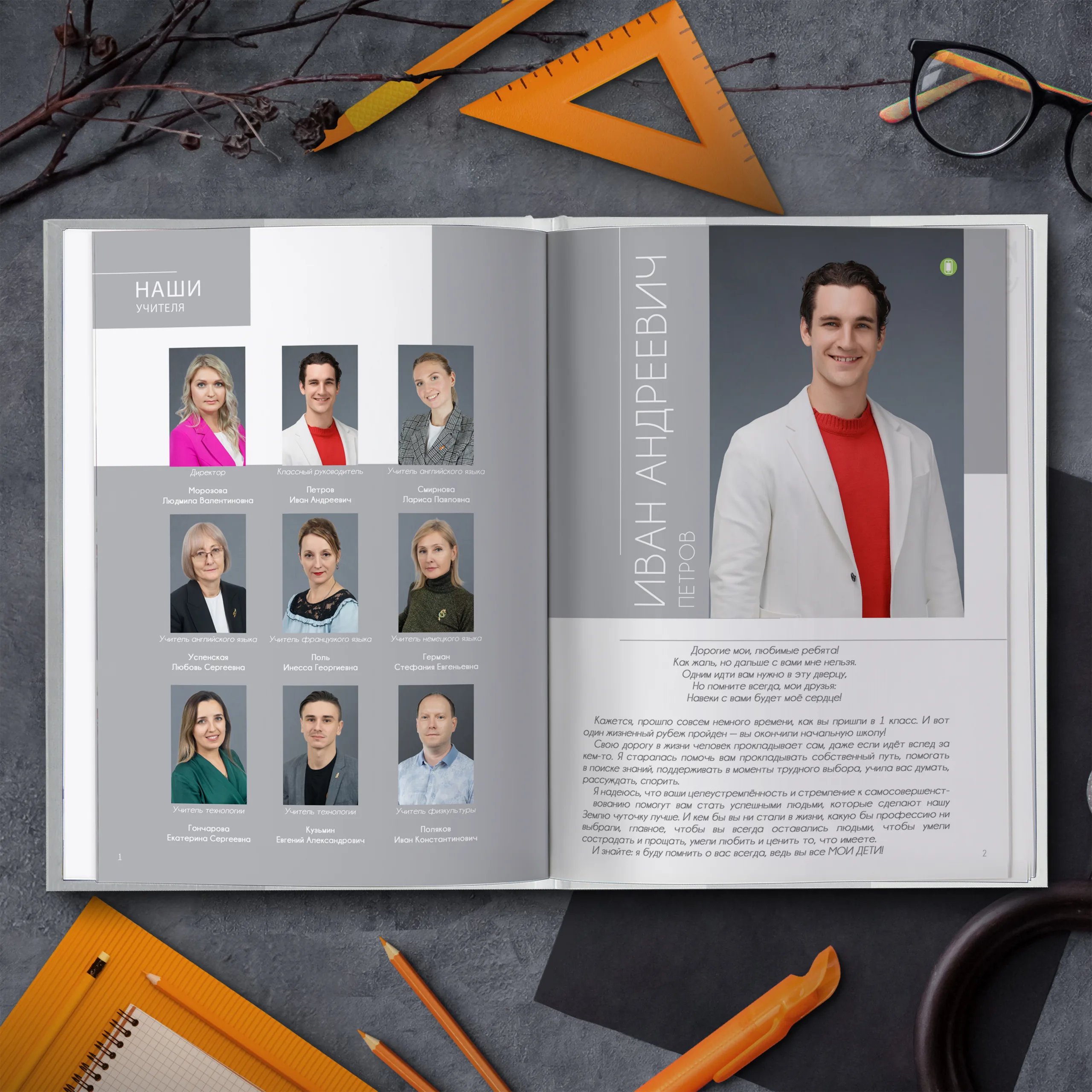 1ый разворот — виньетки педагогов и фотография классного руководителя с напутственным словом